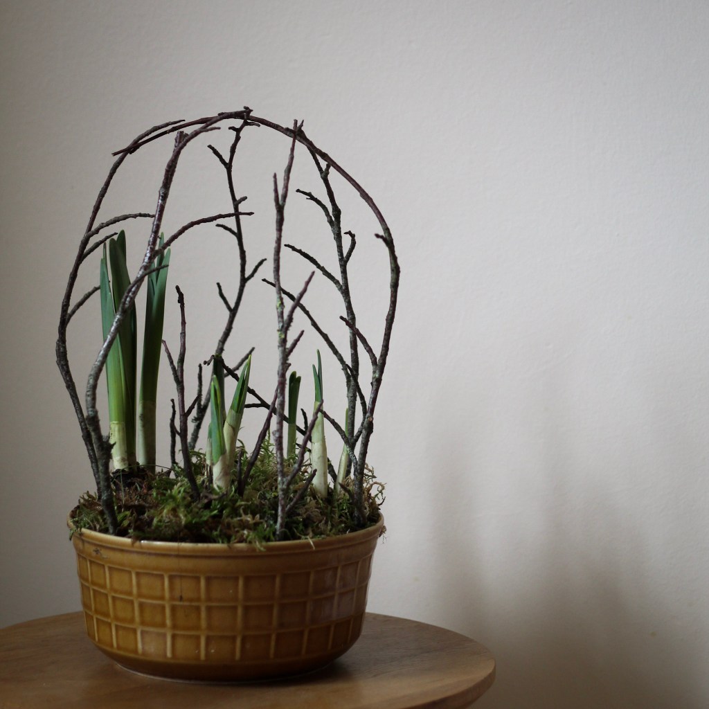 Earlier in the month I potted up quite a few narcissi bulbs to bring inside and watch them shoot up through the moss into flower. They have made me smile every day and I’ll be doing a lot more of this, with all sorts of bulbs next winter.