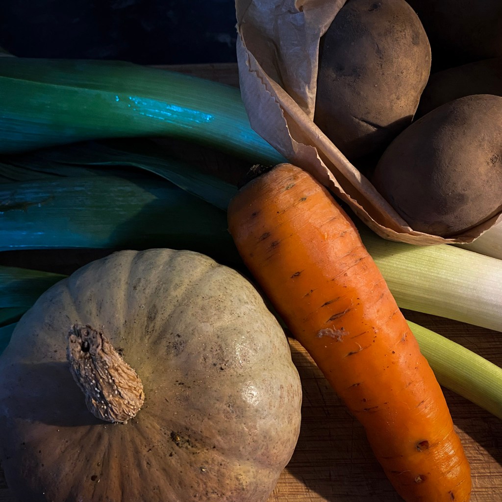 Once we come into the last few weeks of winter our home grown supply of fruit and vegetables has diminished and we are now in the hungry gap. During this time, I try to support local organic growers Kensons Farm when I can, (they have a stand at Salisbury Charter Market if you’re local) who still have a good supply of spuds, carrots, leek and some squash and onions. While standing in line on Saturday to buy some veg, I heard the couple behind me say “I’m just not sure I can eat any more potato and leek soup” We exchanged glances and laughed, I’d just has the same conversation with Dave a few minutes before.